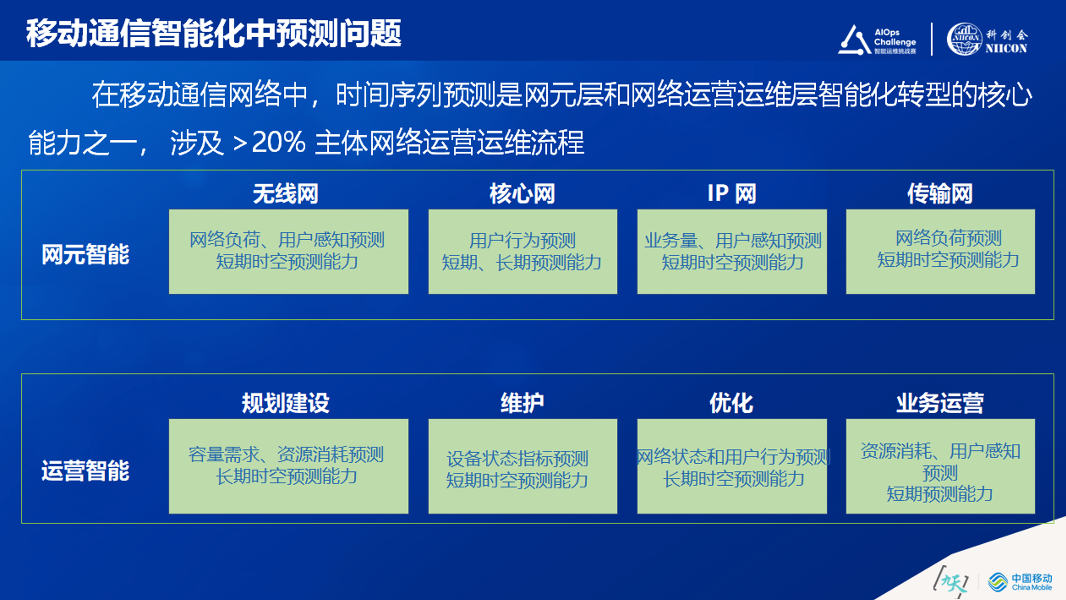 把移动通信网络需要智能化的场景分层,最底层的是网元层,再往上是运营运维层,最上面是服务层。就下面的两层而言,不管是网元的智能,还是运营的智能,都把其中需要用到预测能力梳理出来。