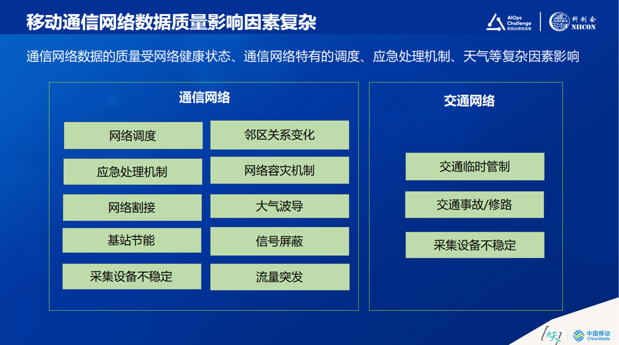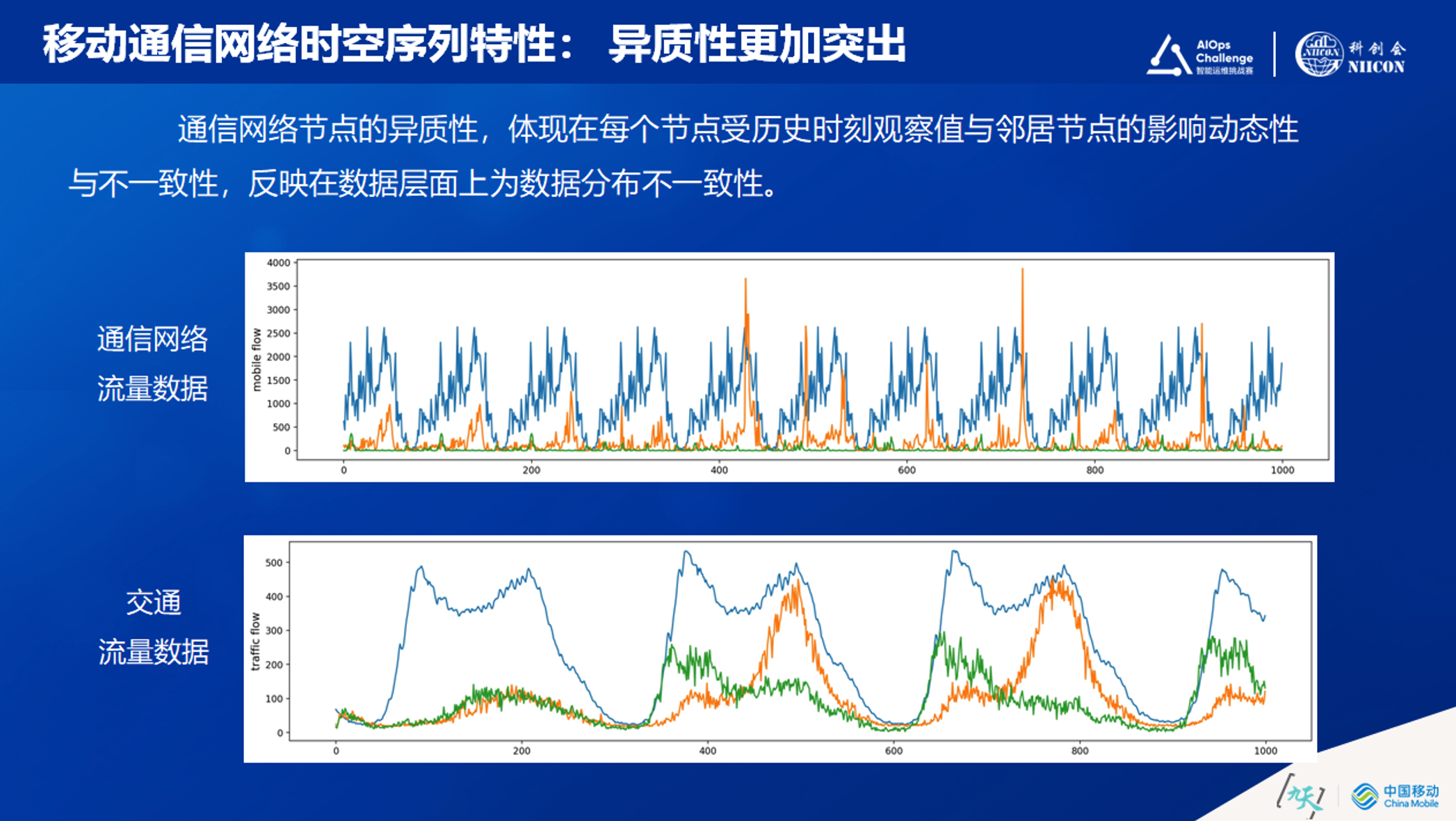 通信网络是一个强运营的网络,网络质量受到各种复杂因素影响。例如:由于网络的各种应急处理机制,网络资源被不断调度;网络各项技术不断升级,导致网络割接非常多;为了“base station节能”采取的动作,会直接影响通信网络质量;随着数据需求的增加,企业存在大量采集设备,采集设备自身也会存在一定的不稳定性;另外还有不断变化的“邻区关系”;还有“天气”因素,如果大雾天在靠海洋的地区会有大气波导对信号的影响;各种“信号屏蔽”,比如高考的时候会有一个信号屏蔽的设备放在周围,这些都会对网络流量造成影响,流量的突发性很大,这些是通信网络中形成时空序列的很多因素。