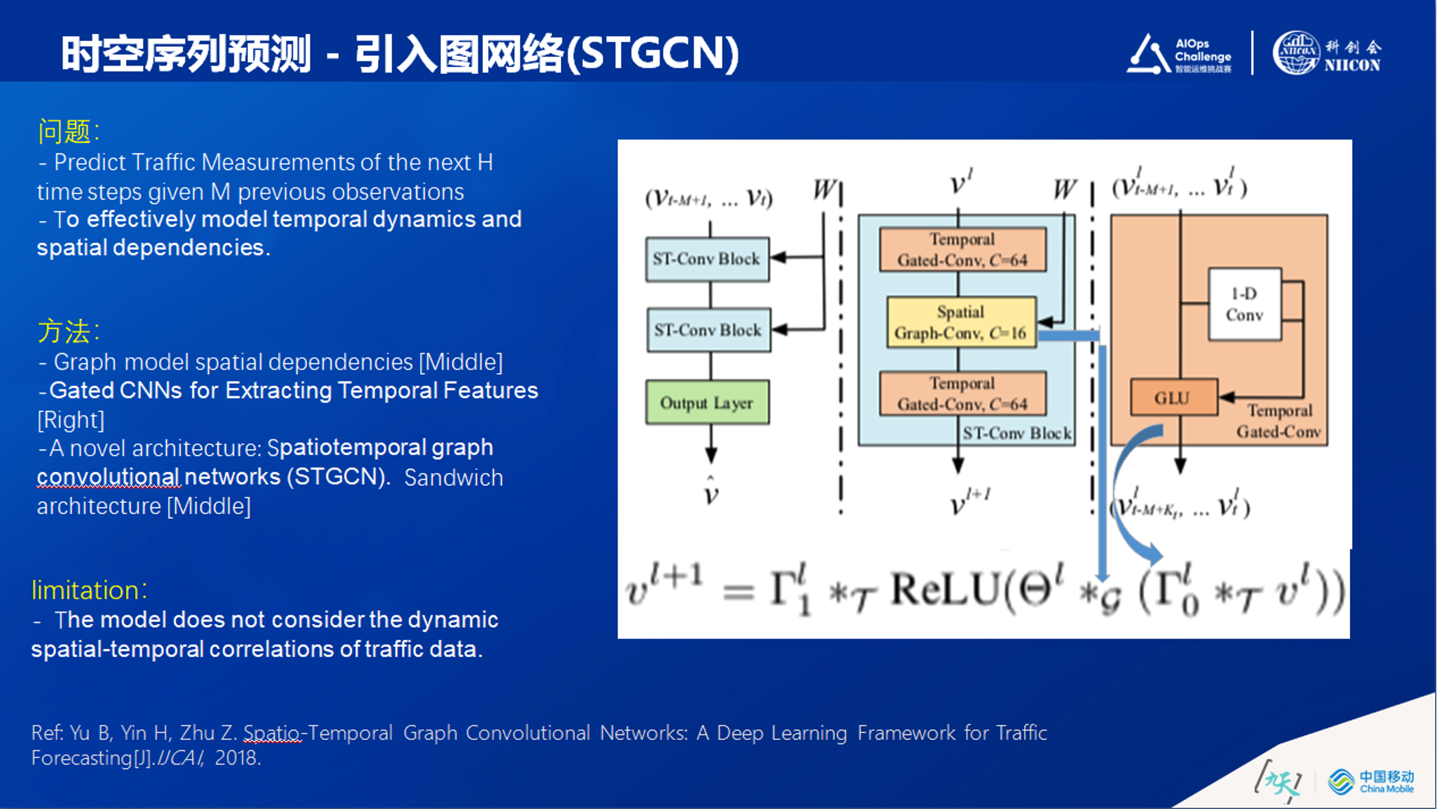 STGCN把图神经网络引入到时空序列的预测当中,有效提取时间域和空间域的依赖关系。本模型首先用Gated-Conv来实现时间信息抽取。与RNN提取时间特征方式不同,Gated-Conv优点在于:不易出现错误累积,可以实现并行处理。模型是三明治式结构,中间层是Spatio graph convolutional提取空域信息,上下用Gated-Conv来提取时域信息。(此外值得一提的是,这几年图神经网络有非常大的进展)。